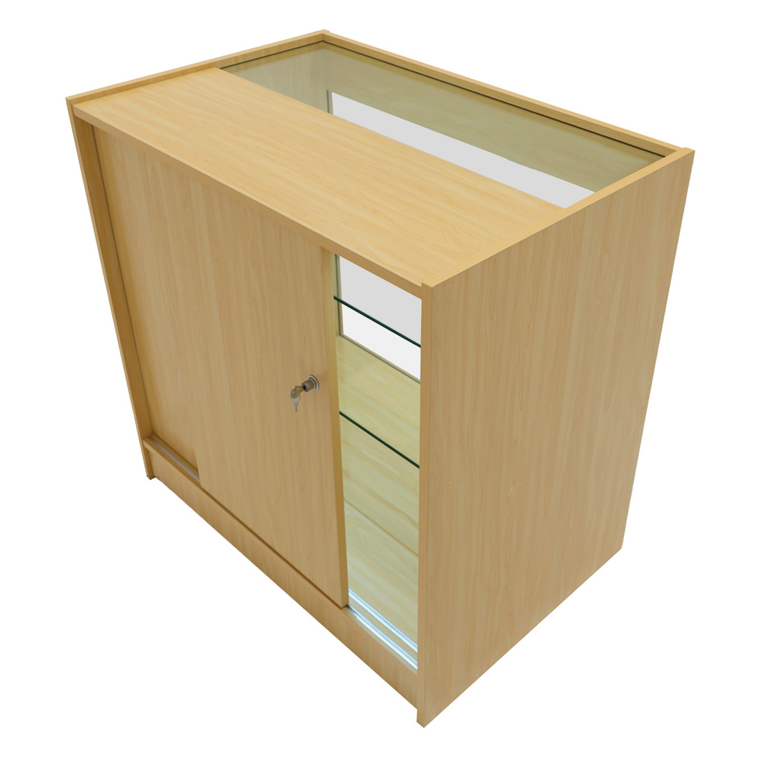 Tous les comptoirs sont fabriqués en MDF de haute qualité avec une finition érable mélaminée durable, assurant une esthétique uniforme et une performance durable. Les éléments en verre trempé du K900 apportent une touche haut de gamme aux zones d’exposition clés.