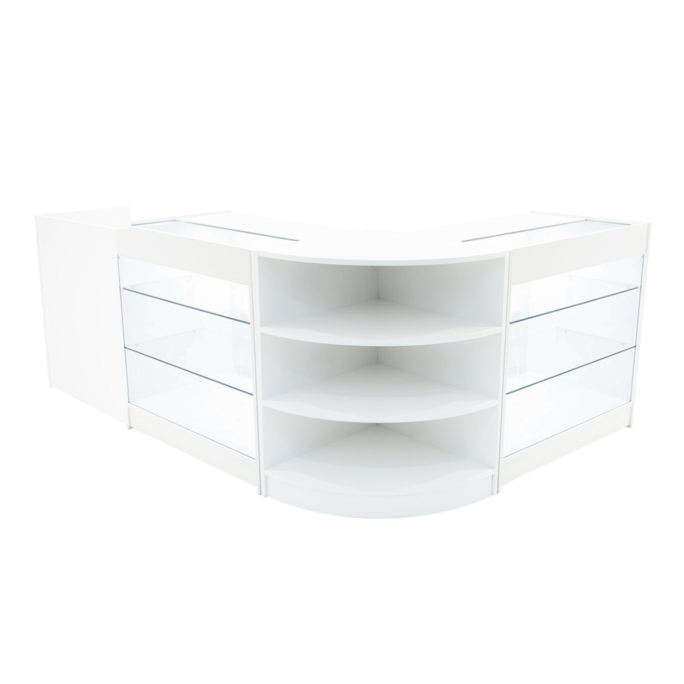 Tous les comptoirs sont fabriqués en MDF de haute qualité, revêtu d’un placage mélaminé blanc résistant, garantissant durabilité et esthétique moderne. Ce matériel et cette finition homogènes assurent une continuité visuelle dans l’ensemble de votre agencement, tandis que les éléments en verre trempé du K900 apportent une touche élégante aux zones d’exposition.
