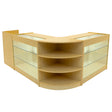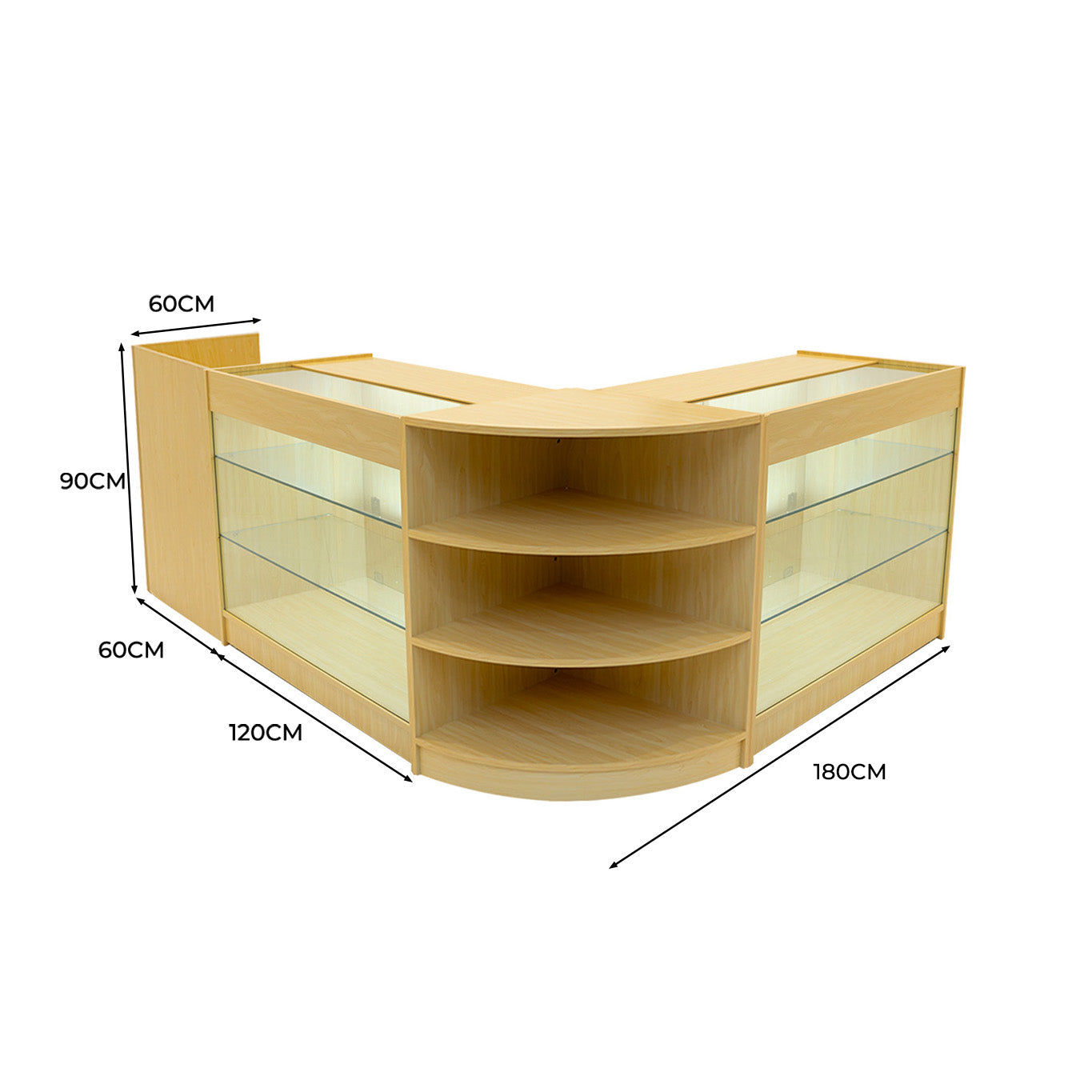 Tous les comptoirs sont fabriqués en MDF de haute qualité avec une finition en mélamine érable durable, assurant longévité, robustesse et un rendu visuel moderne et cohérent. Ce matériel commun et cette finition uniforme garantissent une esthétique homogène dans l’ensemble de votre agencement, tandis que les éléments en verre trempé du K1500 ajoutent une touche haut de gamme aux zones d’exposition.