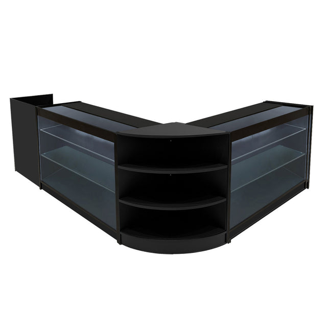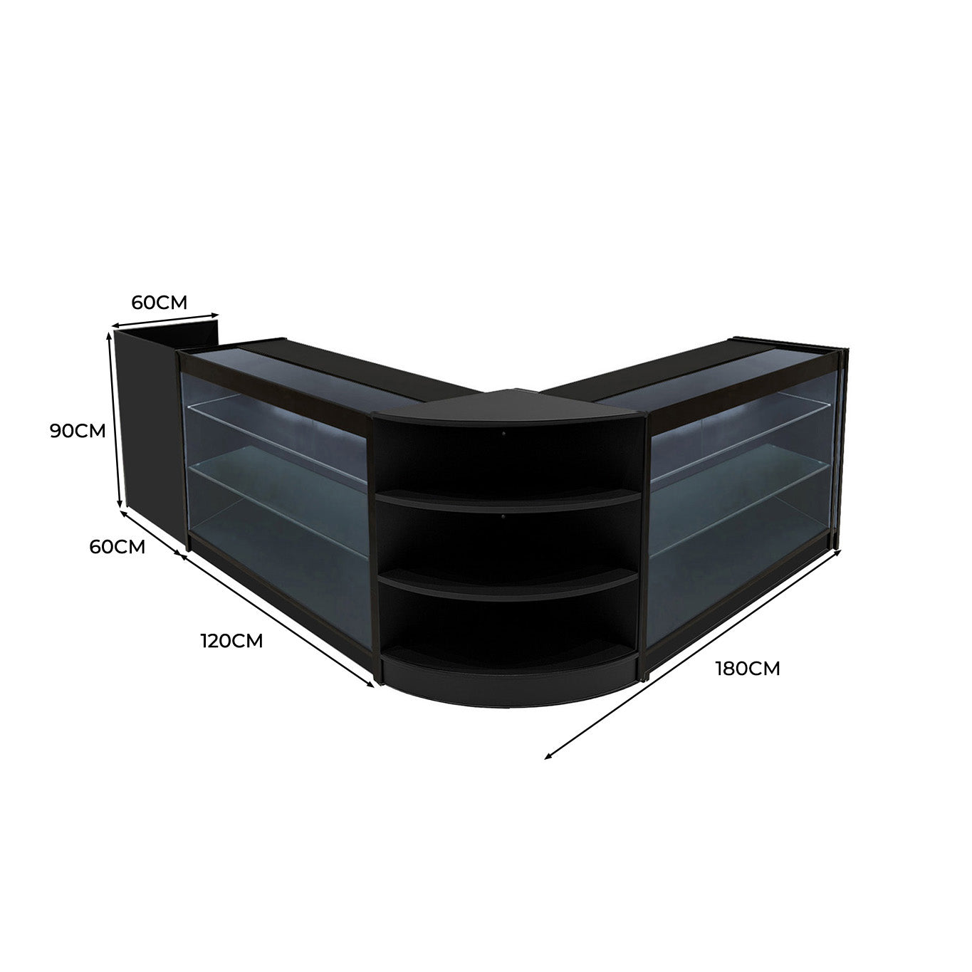 Tous les comptoirs sont fabriqués en MDF de haute qualité, avec un revêtement en mélamine noire durable, assurant performance, longévité et esthétique contemporaine. Ce matériel commun et cette finition uniforme offrent une harmonie visuelle à votre agencement, tandis que les éléments en verre trempé du K1200 ajoutent une touche élégante aux zones d’exposition.