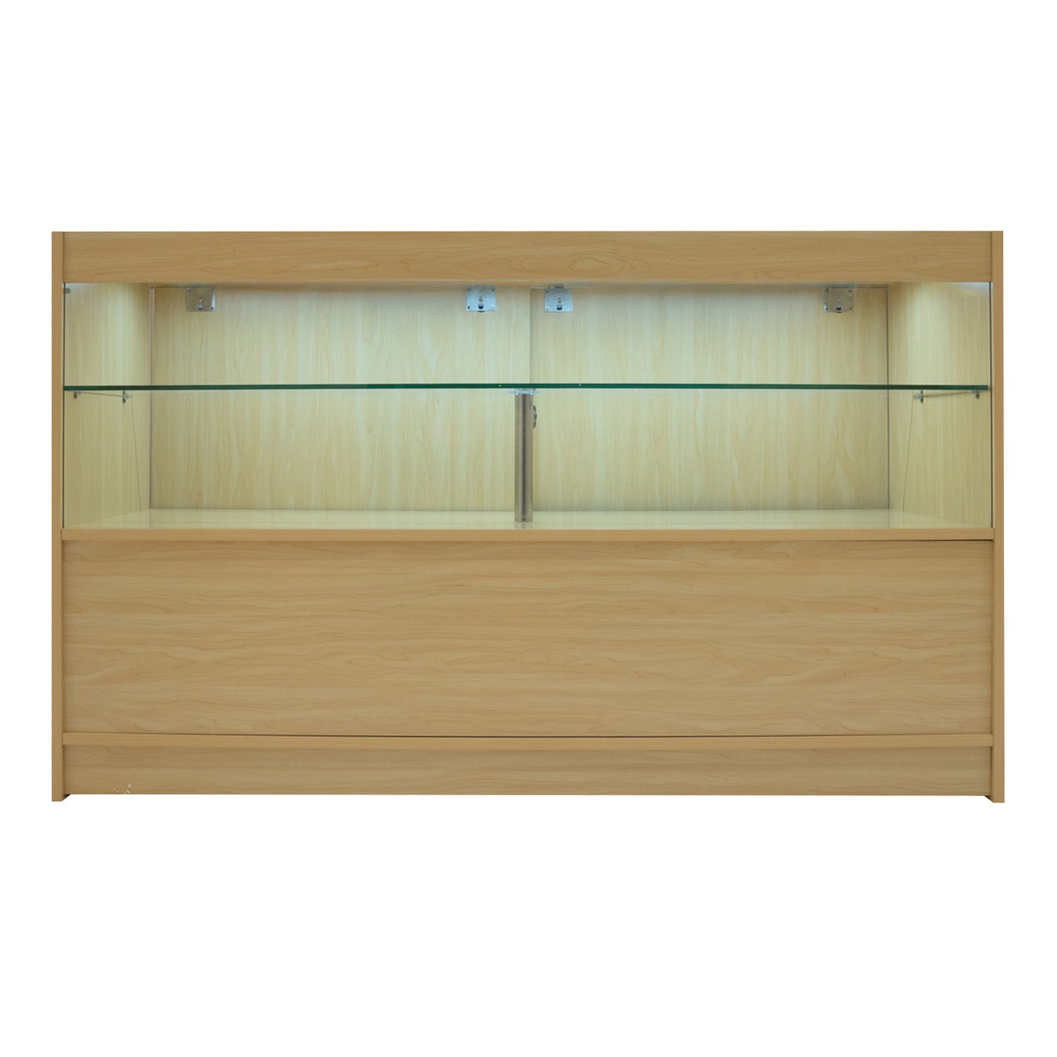 Tous les comptoirs sont fabriqués en MDF de haute qualité avec une finition en mélamine érable résistante, garantissant durabilité, performance et esthétique moderne uniforme. Ce matériau partagé et cette finition coordonnée assurent une continuité visuelle dans l’agencement, tandis que les éléments en verre trempé du C1500 apportent une touche élégante aux zones d’exposition clés.