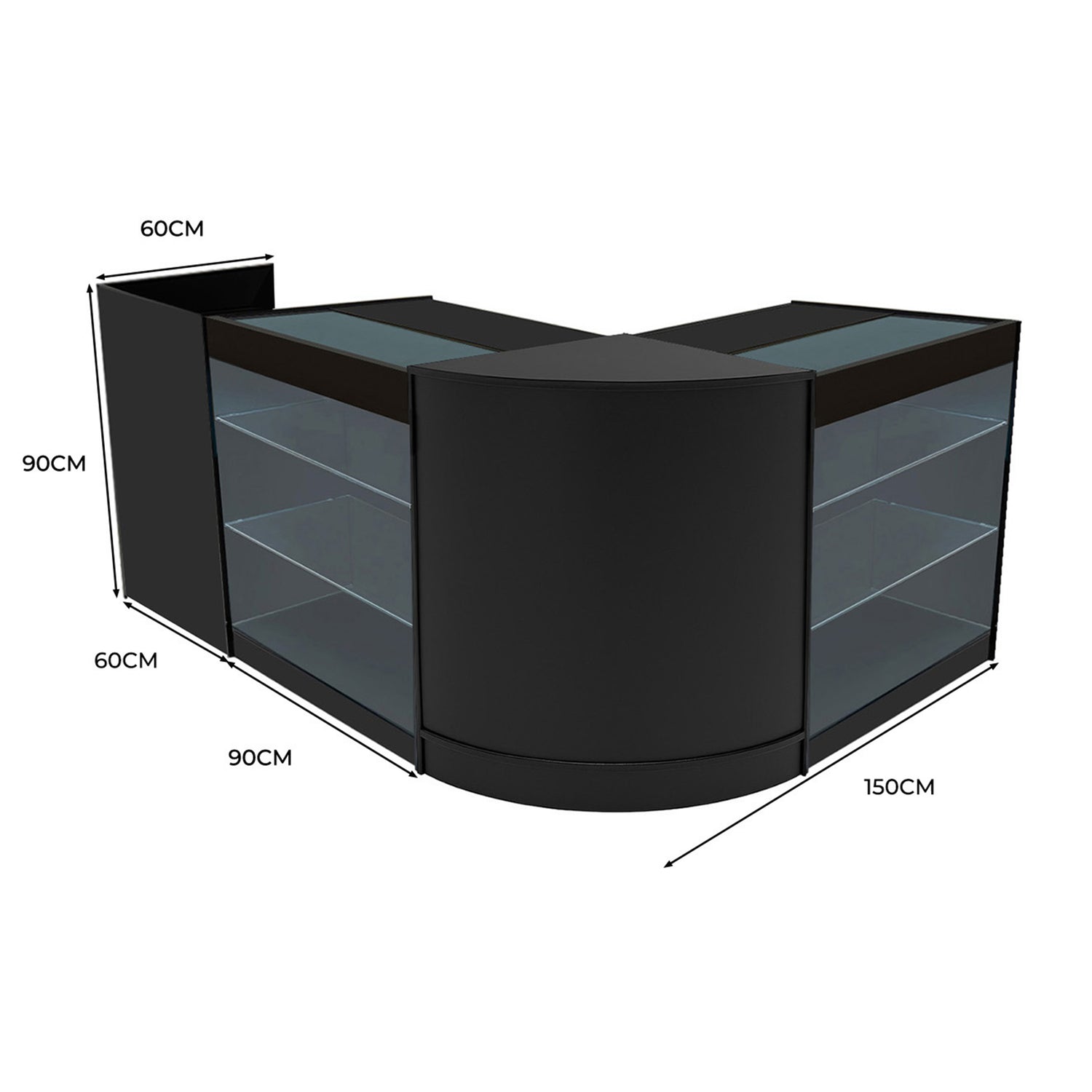 Tous les comptoirs sont fabriqués en MDF de haute qualité avec une finition noire mélaminée durable, assurant une esthétique uniforme et une performance durable. Les éléments en verre trempé du K900 apportent une touche haut de gamme aux zones d’exposition clés.