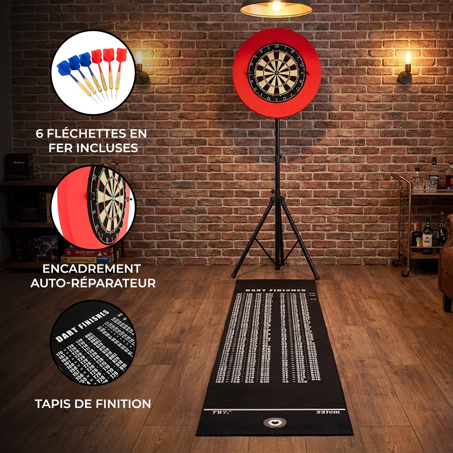 Parmi les éléments phares, on retrouve une couronne de protection auto-réparante. Cet anneau de haute qualité absorbe les fléchettes mal ciblées et retrouve sa forme après l’impact, maintenant votre installation propre et professionnelle sans les marques habituelles d’usure. Sont également inclus 6 fléchettes de précision ainsi qu’un tapis de fléchettes complet, imprimé avec les combinaisons de finition et les équations de score – un excellent outil pour perfectionner votre stratégie de fin de partie et améliorer votre précision.