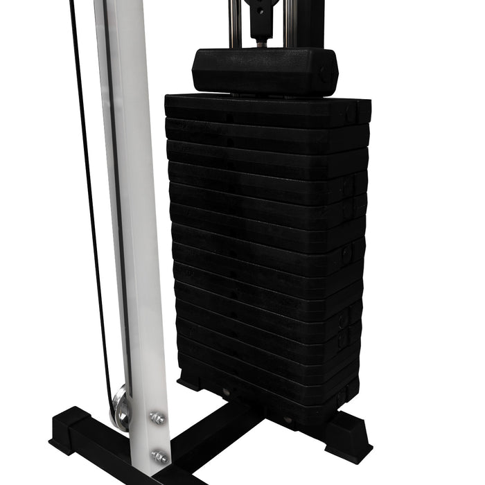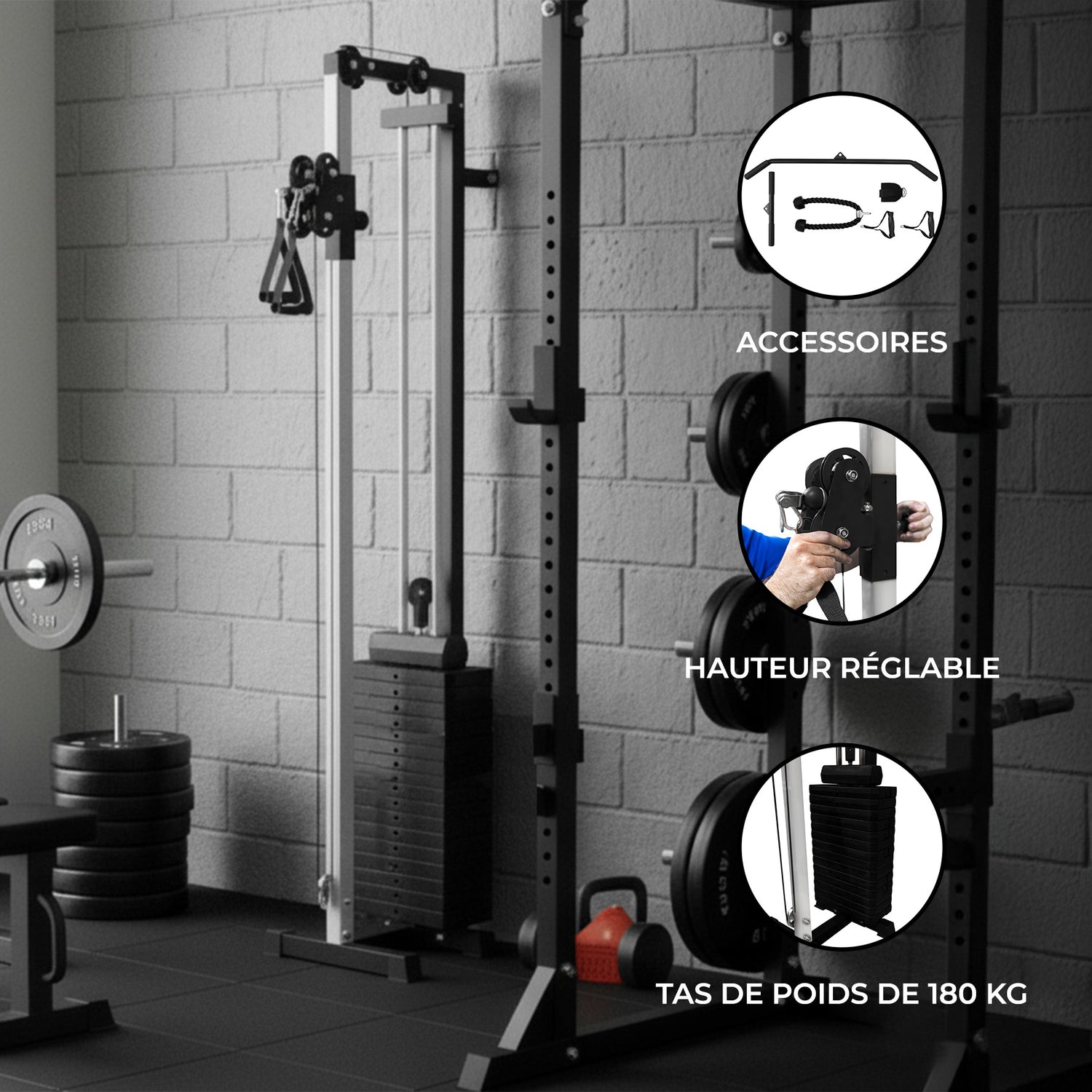 Fabriquée en acier robuste et équipée de doubles poulies en nylon, cette machine garantit un mouvement fluide et constant à chaque répétition. Le système de réglage en hauteur, par paliers de 14 cm sur toute la hauteur de 185 cm, vous permet d’effectuer une variété d’exercices avec un positionnement optimal.