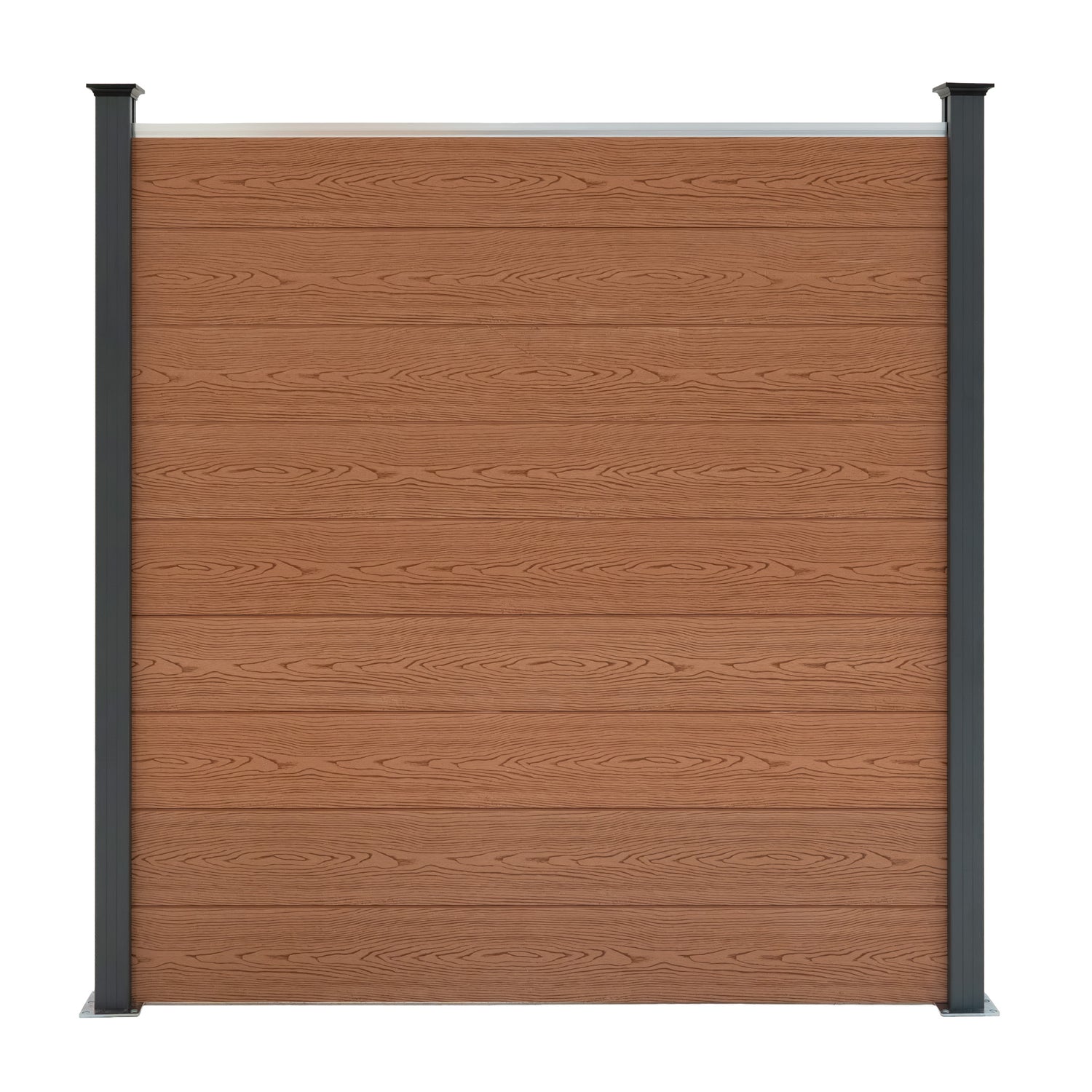 Ce qui distingue cette clôture composite est son design réversible polyvalent : un côté présente un effet bois plein, tandis que l’autre arbore un style moderne à lattes. Les deux faces des panneaux affichent une élégante finition marron, capturant la beauté du bois sans nécessiter d’entretien régulier.