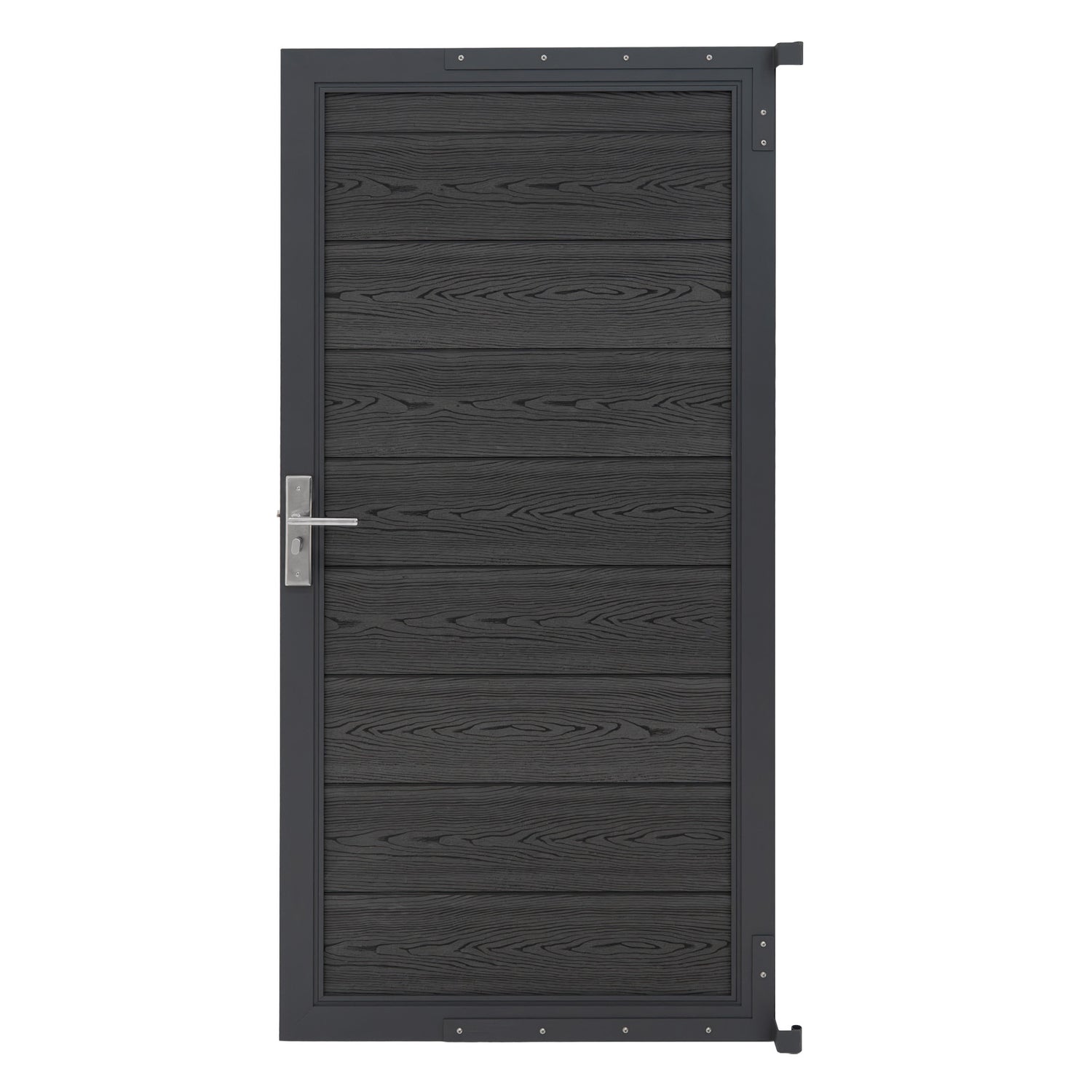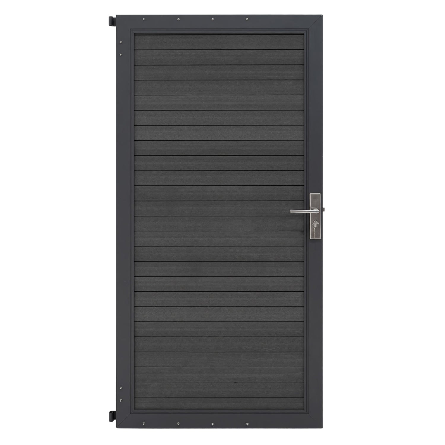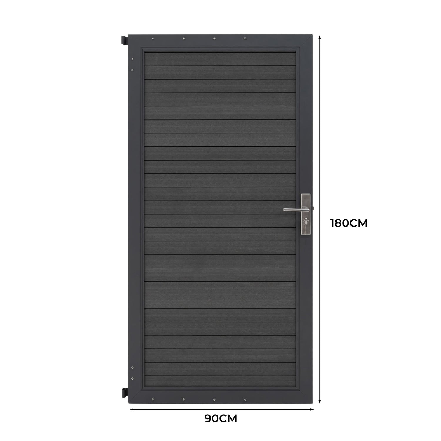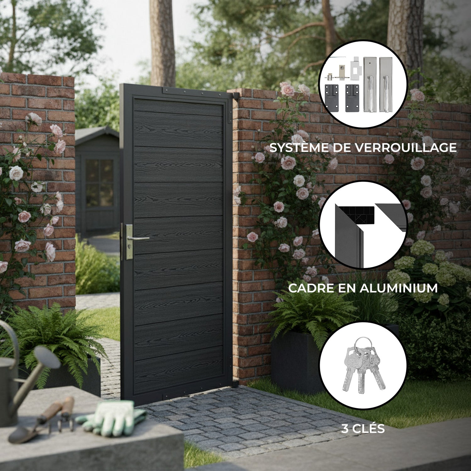 Sur le plan visuel, ce portillon offre une finition réversible distinctive, s’adaptant à vos préférences de style : un côté présente une texture effet bois naturel, tandis que l’autre arbore un aspect moderne à lattes – les deux dans un gris neutre et élégant qui s’harmonise avec tout type d’extérieur. Mesurant 180 cm de haut sur 90 cm de large, il constitue une délimitation esthétique qui préserve l’intimité tout en valorisant l’apparence de votre espace extérieur.