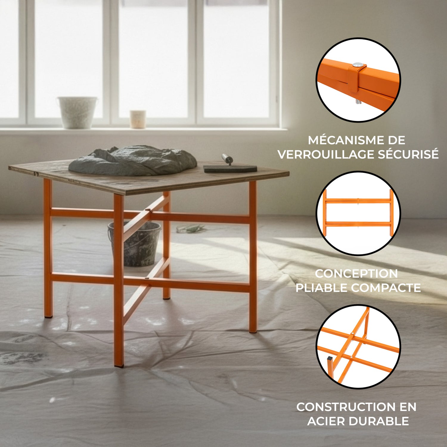 Fabriqués en acier de section carrée 25 mm x 25 mm de qualité supérieure, ces supports offrent une durabilité et une stabilité exceptionnelles sur tout chantier. Leur finition orange par thermolaquage leur confère une excellente visibilité et une résistance accrue à l'usure quotidienne. Conçus pour accueillir des planches d’environ 600 mm x 600 mm, ils allient fiabilité et fonctionnalité pour un usage professionnel quotidien. Chaque lot comprend trois supports, offrant une couverture flexible de votre zone de travail et garantissant un maintien optimal à tout moment.