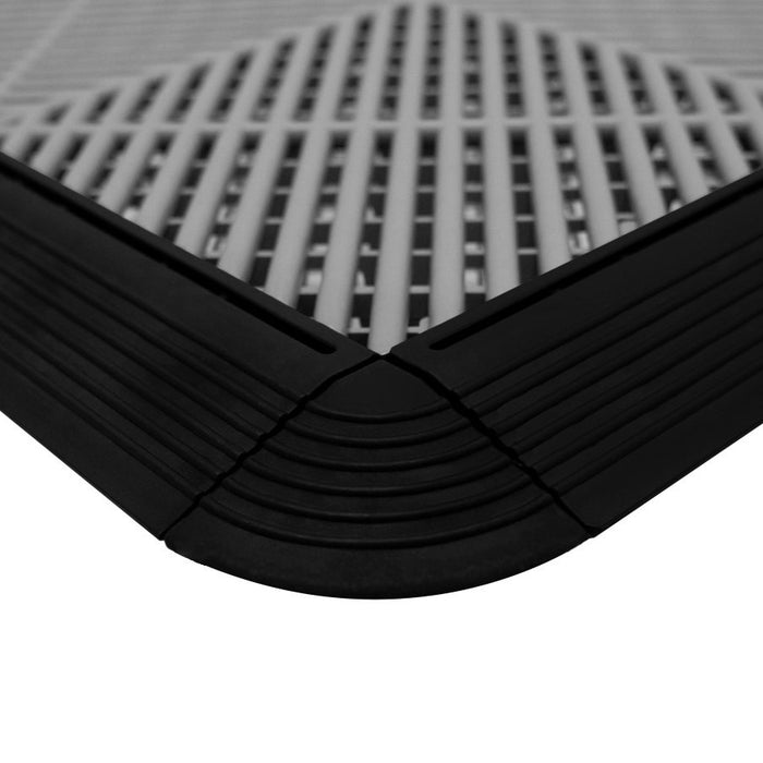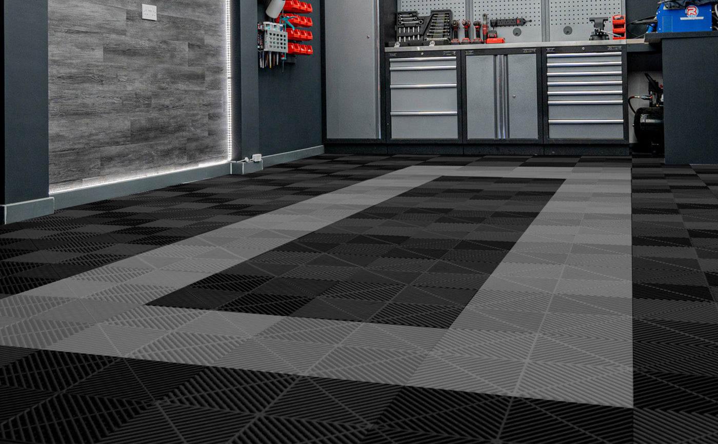 Cet ensemble de 120 carreaux (90 noir & 30 gris) imbriqués et 46 pièces de bordure constitue une solution complète de revêtement de sol, couvrant généreusement 19 m2 dans une configuration de 8 x 15 carreaux. Que vous soyez propriétaire, passionné d’automobiles ou professionnel, ce système de revêtement est conçu pour répondre aux exigences des environnements les plus occupés et les plus difficiles.